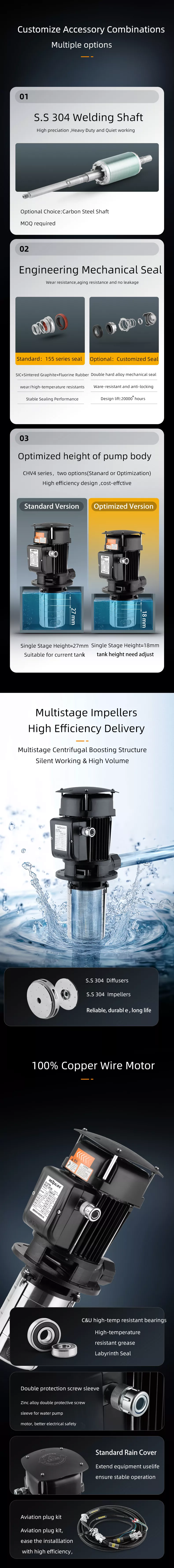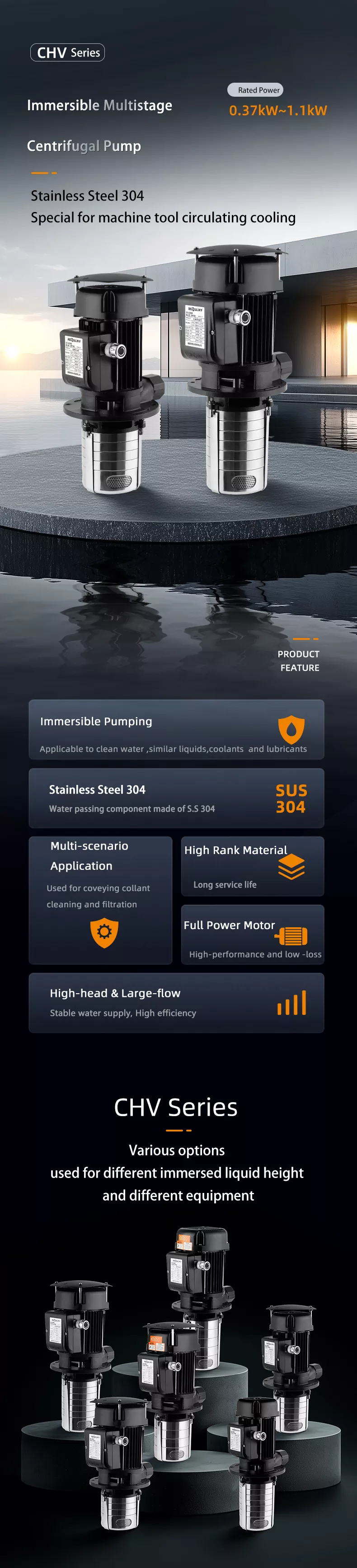 Järgnev on CHV-seeria sissejuhatus. CHV sukeldatavat mitmeastmelist tsentrifugaalpumpa, mida tuntakse ka sukelpumbana või masina toopumbana, kasutatakse tööpinkide jahutusvedeliku, määrdeaine, kondensaadivee ülekande, tööstuslike puhastusseadmete, filtreerimissüsteemide ja muude sukelpumba kasutamiseks sobivate rakenduste transportimiseks. See sobib ideaalselt integreerimiseks tööpinkide, lihvimismasinate, CNC-töötluskeskuste, EDM-masinate, tööstuslike puhastusmasinate ja muude seadmetega.